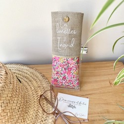 Etui à lunettes personnalisable ( ou pas) en lin naturel, magnifique Liberty Emma et Georgina Hibiscus et passepoil doré pailleté, l'autre face en simili cuir,