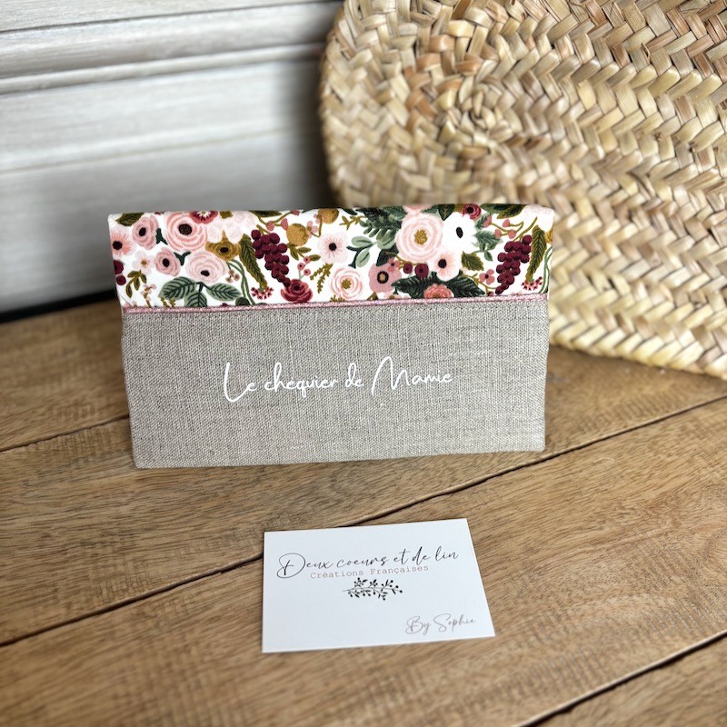 Porte chéquier en lin naturel et cotonnade Garden Party, passepoil saumoné pailleté, doublé de coton et triplé pour lui donner un peu de moelleux