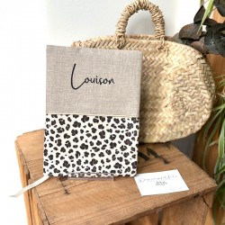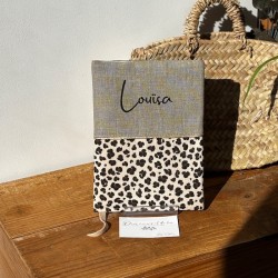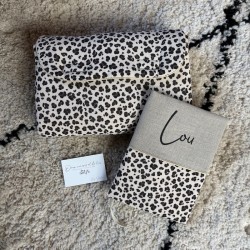 En lin naturel et double gaze, passepoil assorti, doublé en coton bio et triplé en molleton, marque page