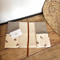 En lin naturel et jolie double gaze aux motifs fleuris dans les tons ivoire, noisette et gris, passepoil assorti, doublé en coton recyclé et triplé en molleton, marque page