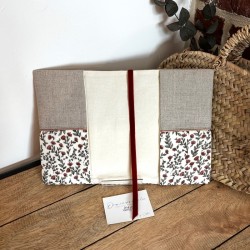 En lin naturel et jolie double gaze aux motifs fleuris dans les tons ivoire, kaki et terracotta, passepoil assorti, doublé en coton recyclé et triplé en molleton, marque page