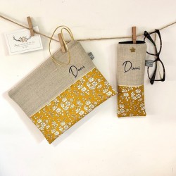 1 face lin naturel et Liberty of London Liberty Capel Moutarde séparés d'un passepoil or irisé